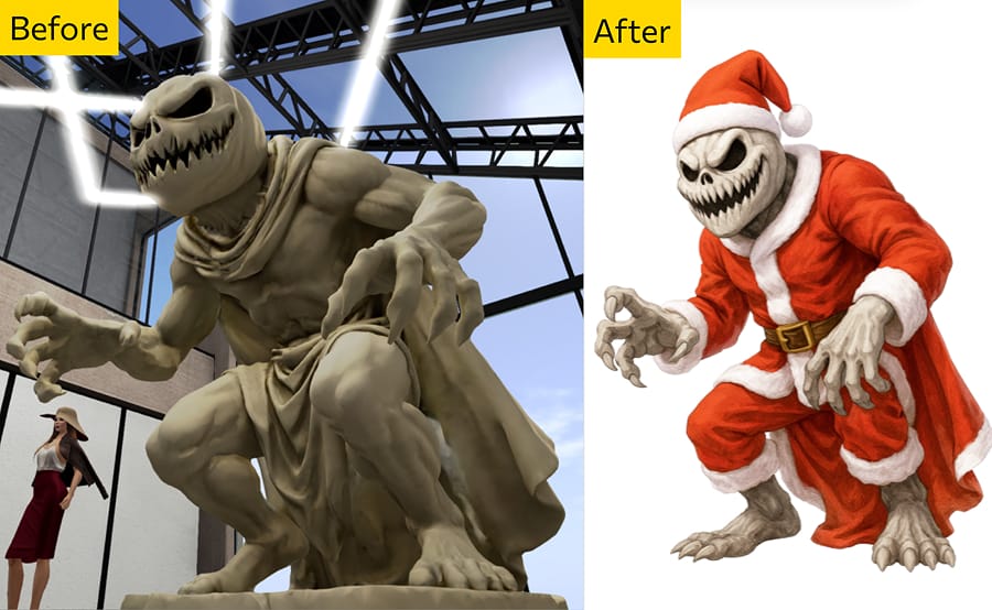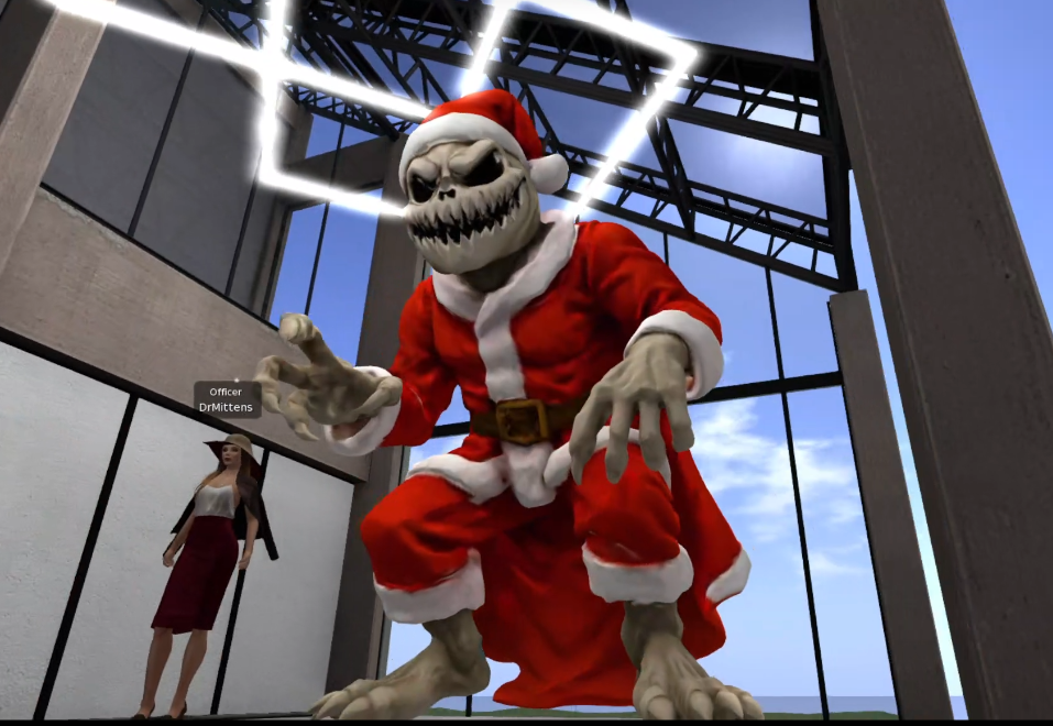 I uploaded this photo to MeshZeus and in just two minutes got a 3D model of our monster in a Santa costume. And he looks amazing! Generating this Scary Santa cost me just L$200. And yep — in just 10 minutes, our Monster got a new outfit and a spot in the office.