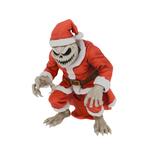 Prompt:"This monster is wearing a traditional Santa Claus costume : red coat with white fluffy trim, black leather belt with gold buckle, red pants and a classic Santa hat. "
