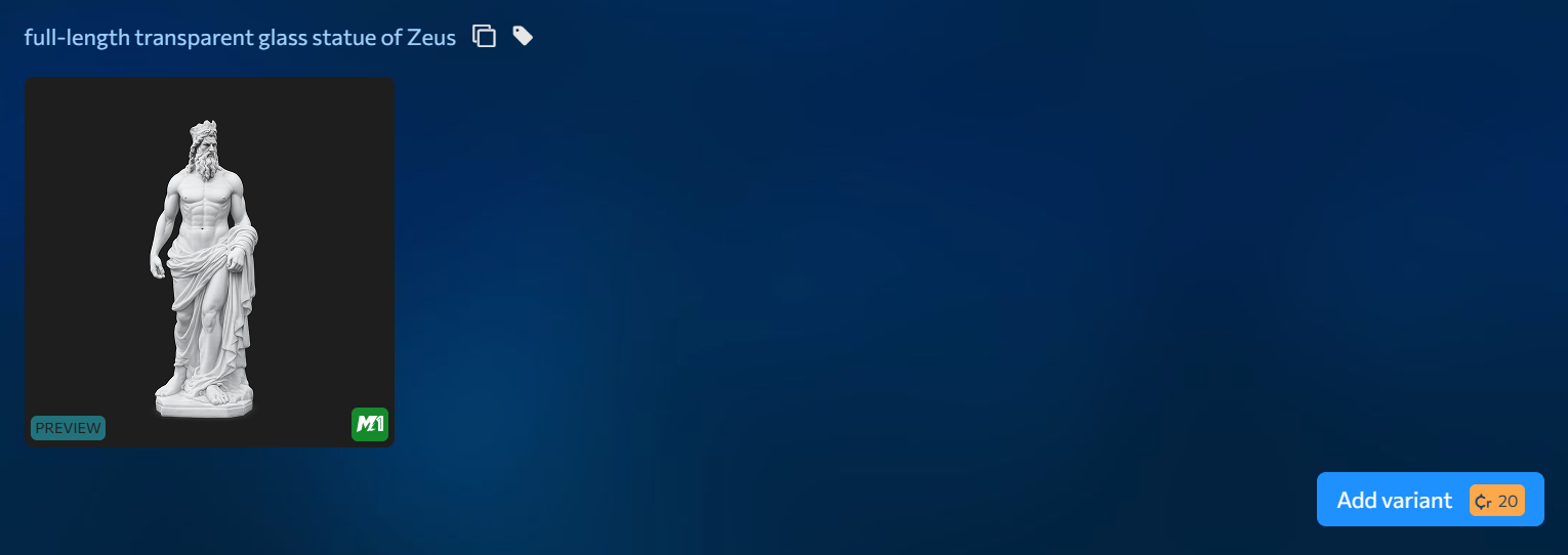Within a couple of minutes after submitting the prompt, the system will generate a 3D object without a texture. It will look a bit like a plaster statue — this is just a preview version of the model. At first it may feel a little surprising, but this is a normal part of the process. If you don’t like the preview, you can regenerate it for L$20.