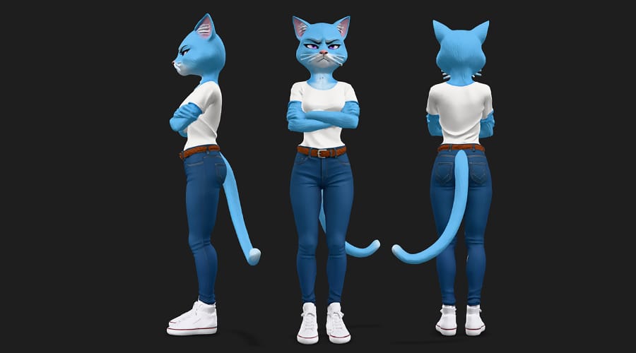 Banana’s blue cat actually looks way more human-like and a lot less cartoonish. She’s got long legs, a clearly feminine shape, and yep — that grumpy face we asked for is definitely there.
