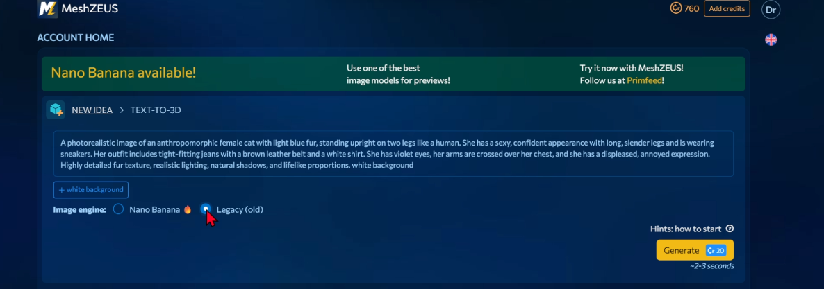 You can now generate 2D images using Banana, Google’s powerful neural network. This makes it even easier to create detailed previews that can later be turned into 3D models.