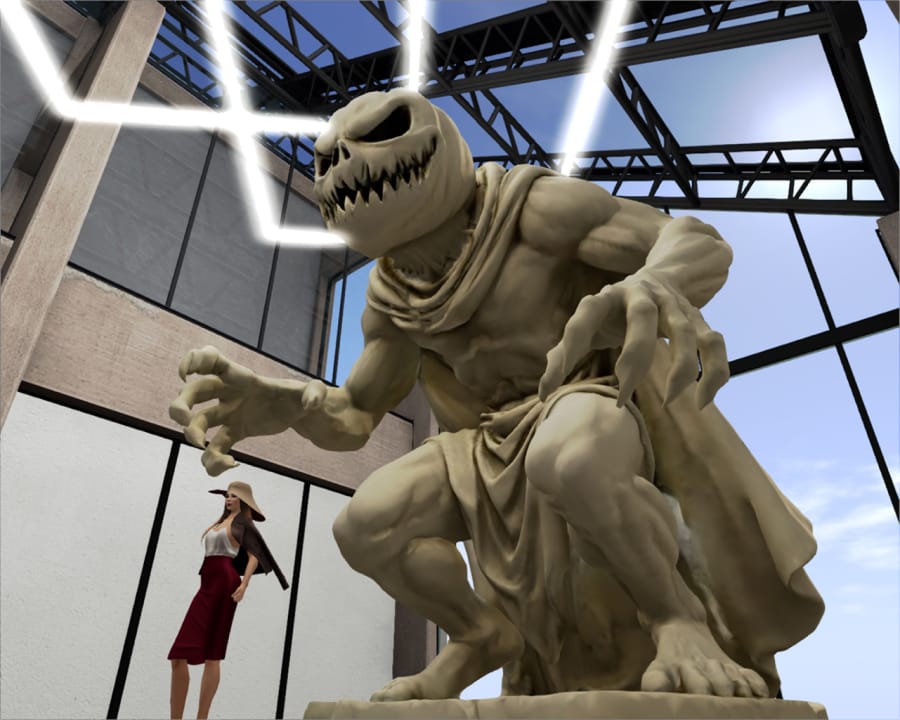 ChatGPT helped us create this monster. After several iterations, we found the perfect pose. Then we uploaded the image we liked to MeshZEUS, where AI generated the perfect mesh statue for Second Life.