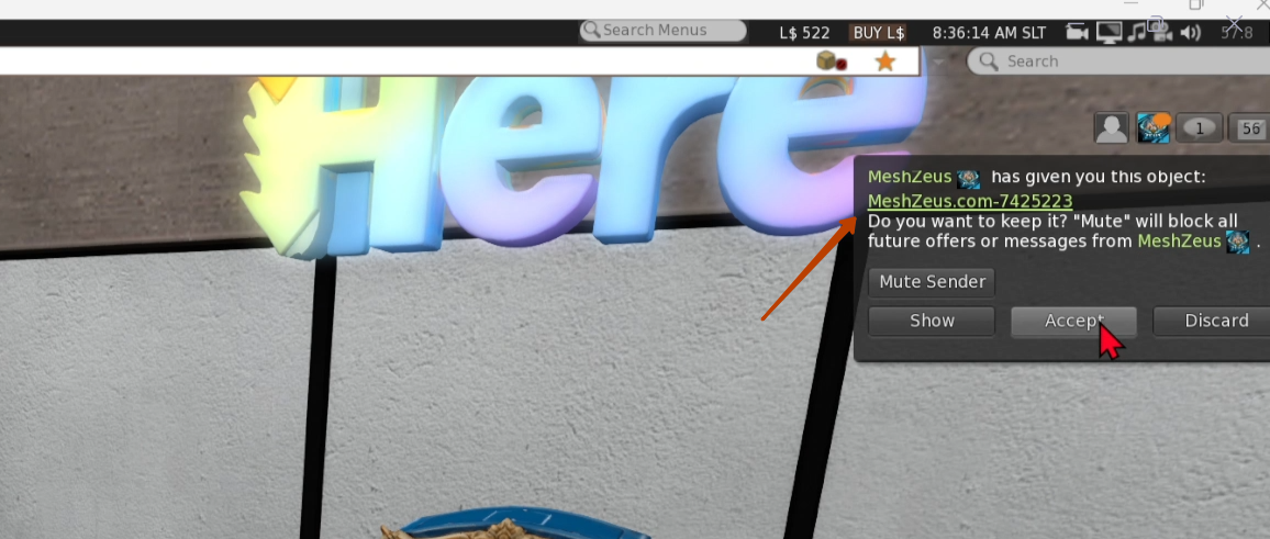 Next I switch to Firestorm. Here I receive a notification about a new object. I accept the object. Then I open my inventory and find my new object there.