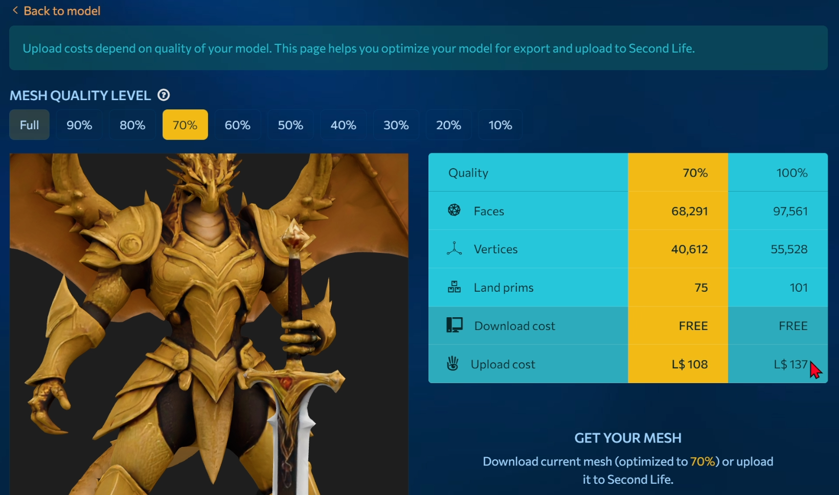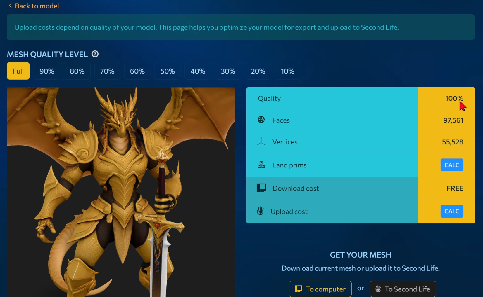 We see the optimization and export page. Here you can choose the model quality as a percentage. Let’s calculate the land prims and the upload cost for 100%. This isn’t required, but it will be useful as an example. Click Calculate.