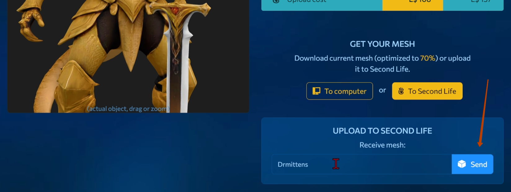 There’s no need to download the object to your computer first and then upload it separately to Second Life. Of course, that option is still available if you prefer it. But now you also have a faster and more convenient way to send your mesh straight to your objects in-world.