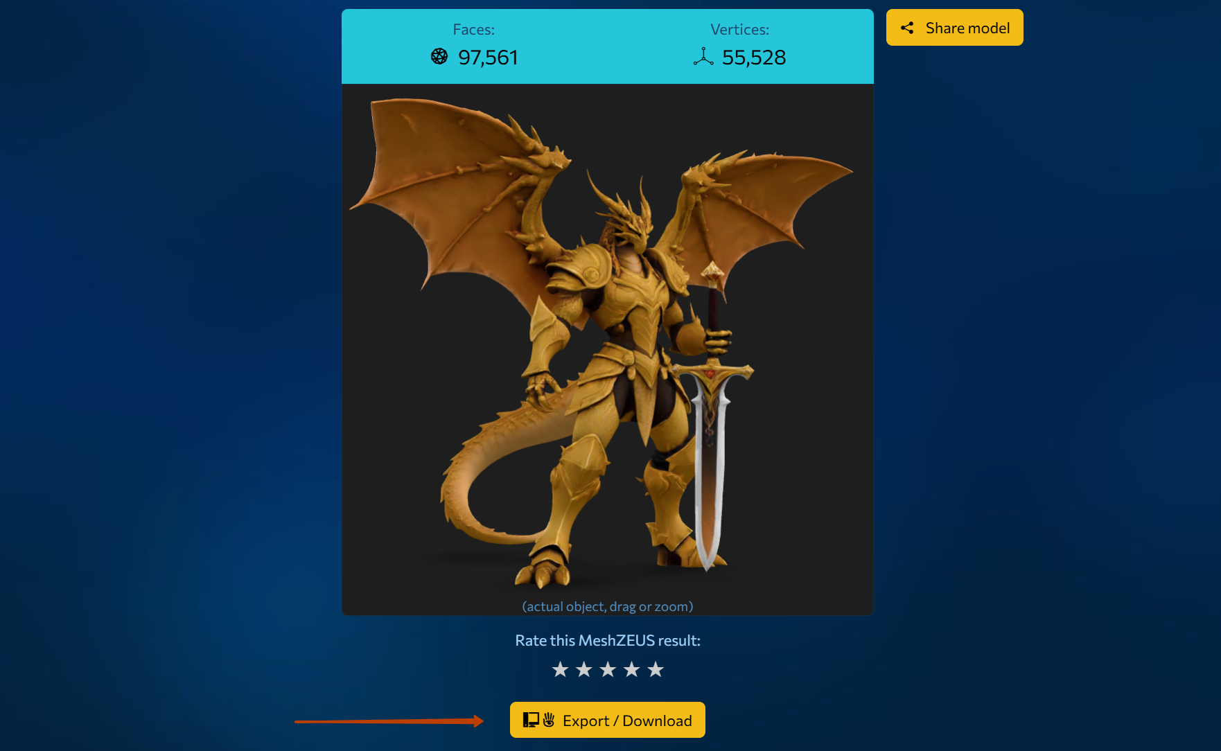 Then click the “Upload Model” button. The upload cost is shown on the button. Important: the upload cost is deducted from your Meshzeus balance.